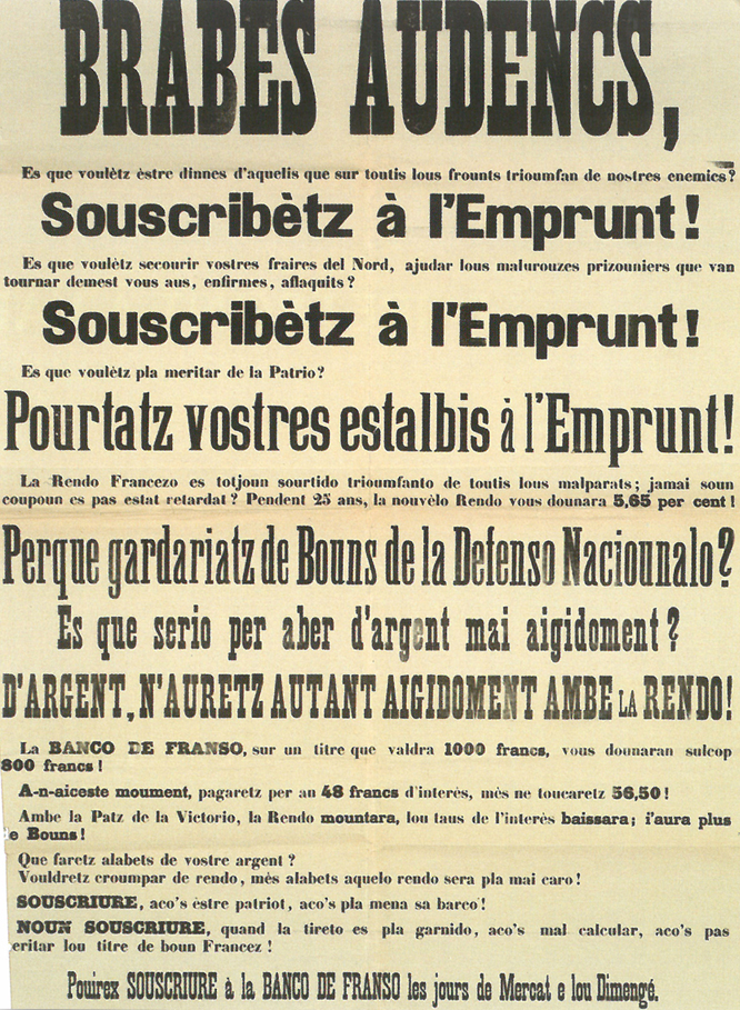 Affiche « Brabes audencs... Souscribètz à l’Emprunt ! » Coll. Archives départementales de l’Aude (1M1069)