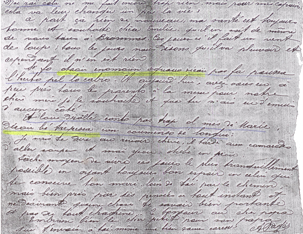 Dans cette abondante documentation, on trouve au final assez peu d’occitan, de breton, de basque etc. Le français est en effet pour la génération de 1914 la seule langue d’écriture apprise à l’école, l’occitan ne transparaît qu’occasionnellement dans les lettres des soldats et de leur famille, écrite de façon phonétique pour exprimer un mot ou une expression mal maîtrisés en français ou ressentis comme intraduisibles. Pour autant, comme l’ont bien établi Gérard Braconnier et André Minet dans leur ouvrage consacré aux correspondances des soldats du midi, les productions écrites ne rendent compte que de manière indirecte de l’usage massif de la langue à l’oral entre soldats venus des différents pays de l’espace occitanophone. La guerre a d’ailleurs ici sensiblement participé à la conscience de l’unité de la langue occitane parmi les soldats gascons, languedociens, limousins, auvergnats ou provençaux. Nombreux sont les témoignages de ces soldats qui se découvrent un “parler” commun avec leurs compatriotes venus d’autres régions occitanophones.